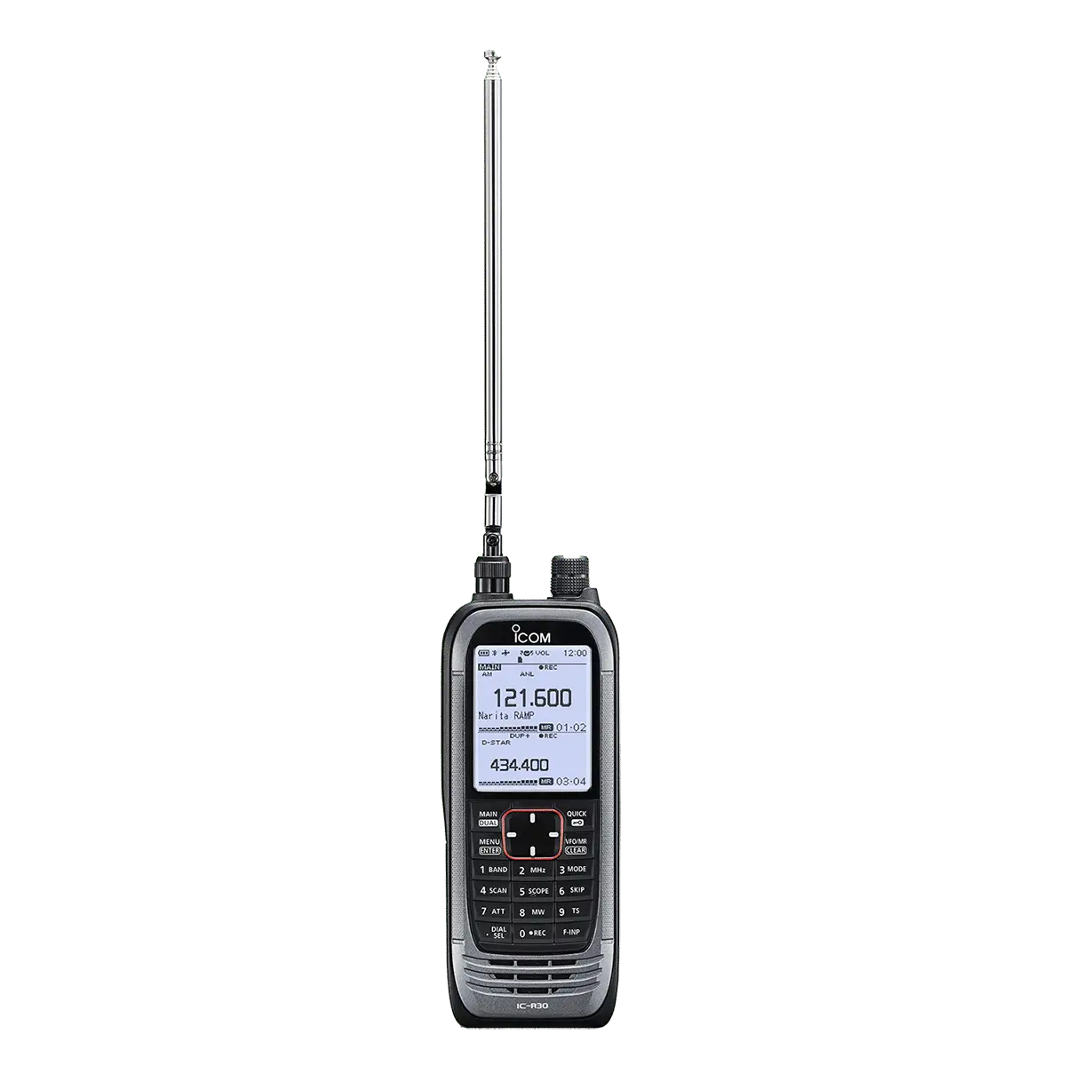 цифров и аналогов широколентов преносим приемник от ICOM с функции Двойно наблюдение и Запис на два банда. Може да сканира до 200 канала в секунда.